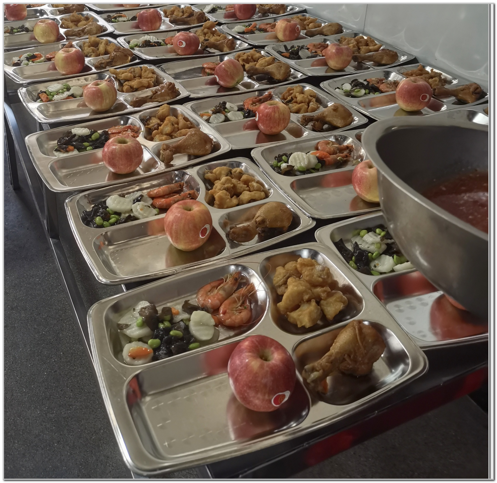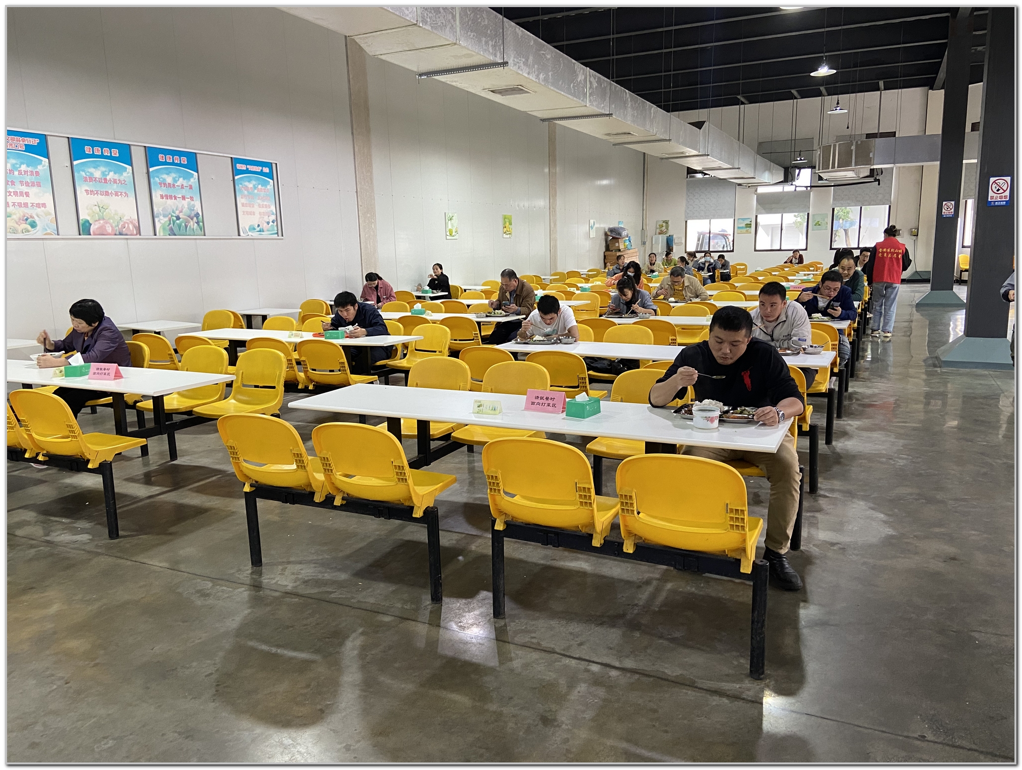 員工食堂實(shí)行免費(fèi)統(tǒng)一配餐,通過(guò)非接觸式食材采購(gòu),確保食材安全充足,就餐“一人一桌”,分時(shí)段有序用餐,減少人員密集接觸。